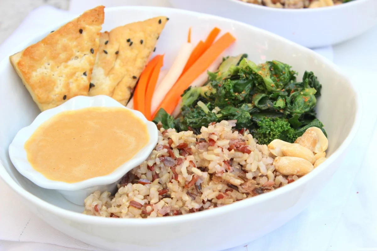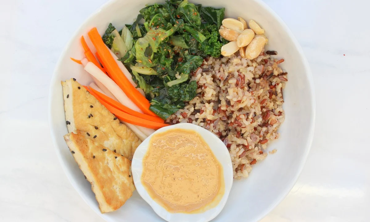 - Load your bowl with greens, cooked rice, roasted peanuts, pickled veggies, slices of tofu and the dressing. If you like cilantro, pour a few leaves on top!