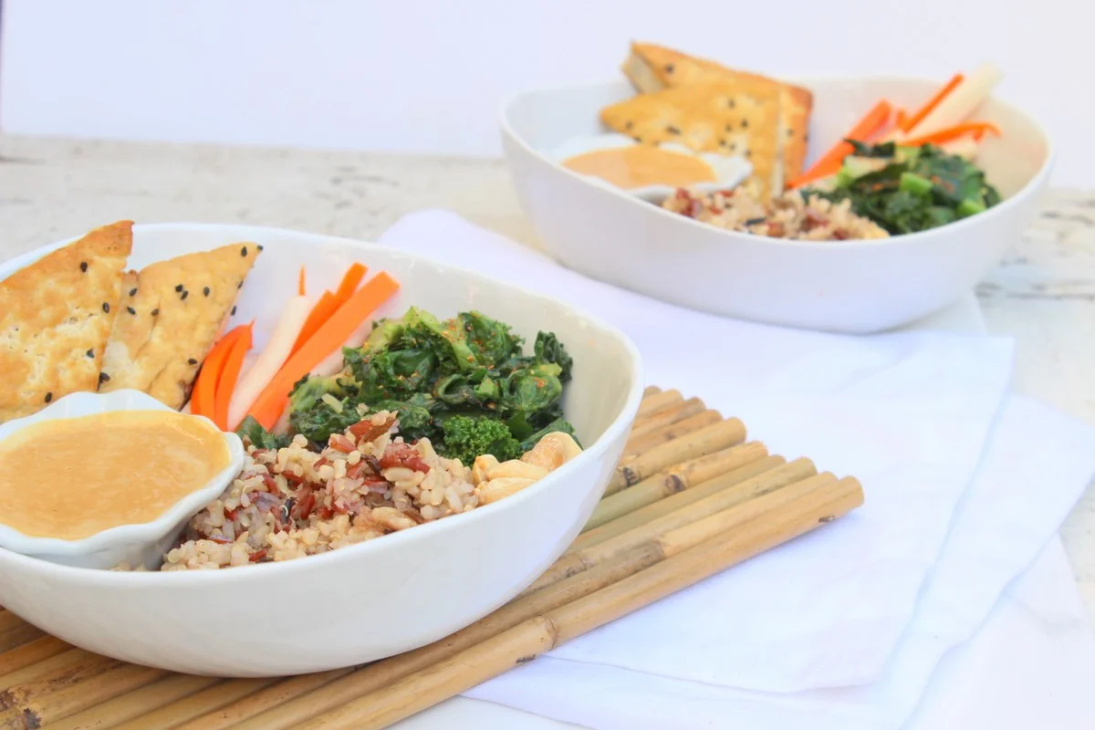 Let's talk about bowls. Remember my Autumn Harvest bowl ? The idea is pretty simple: a meal-sized bowl filled with tons of raw, roasted or steamed veggies, some whole grains, a protein (beans, seeds, nuts, tempeh, tofu) and a sauce. It's also the perfect way to use your leftovers. I LOVE them! And since I found the perfect ones (thanks to Crate and Barrel!), we eat almost everything in a bowl!